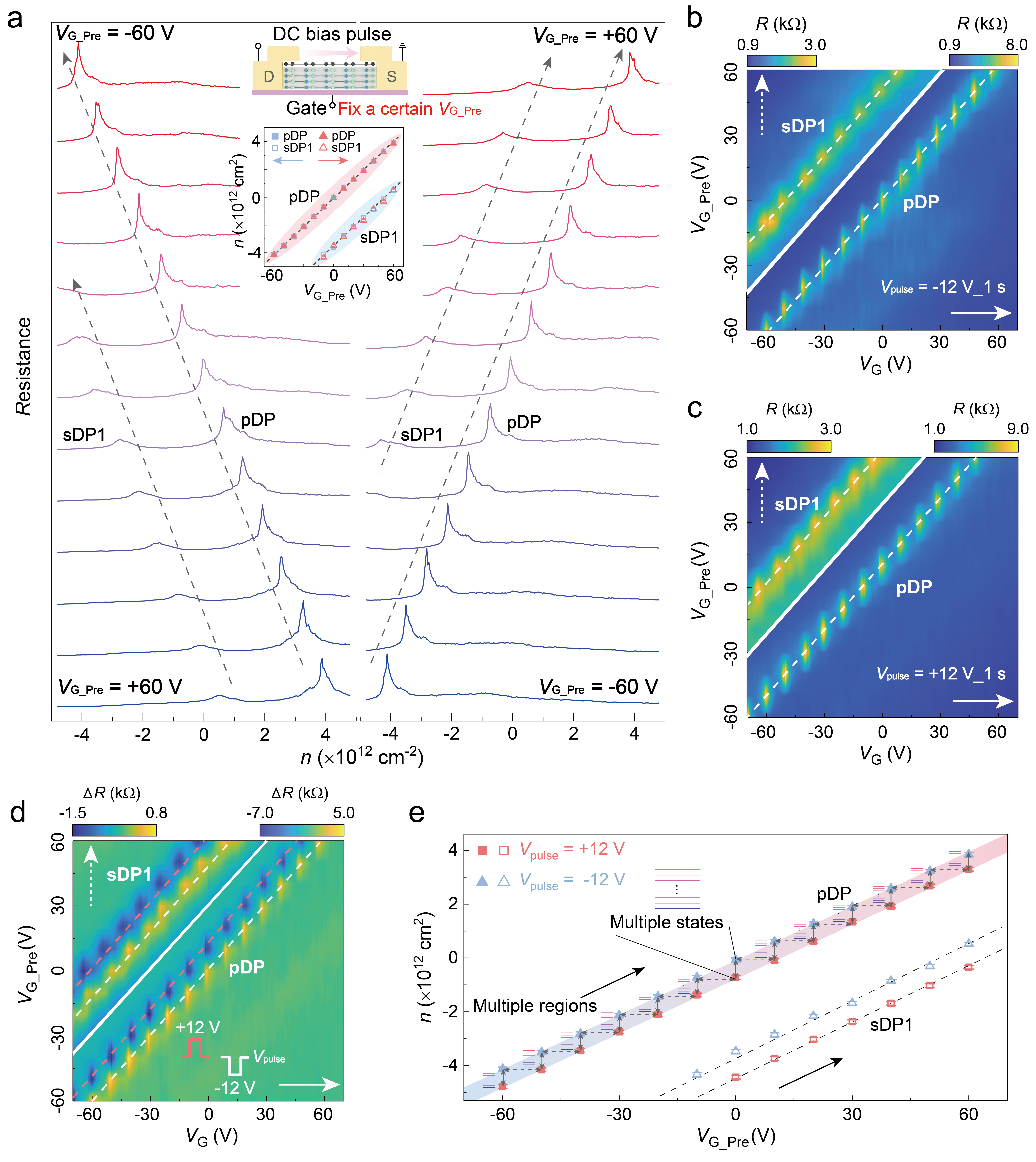 在Gr/hBN器件中,除源-漏脉冲外,栅极电压构成了另一个载流子状态调控的自由度。如图4(a)所示,在施加源-漏脉冲的同时预设一个栅极电压(VG_Pre),Gr狄拉克点对应的载流子浓度都与VG_Pre参数呈显著的线性相关,这说明体系的载流子浓度以一种标准的线性关系被精确锁定在一个与VG_Pre相关的位置,即电荷锁定效应。更重要的是,图4(b)-(d)中正负源-漏脉冲作用下的电阻差异图表明,电荷锁定效应与滑动铁电性可协同扩展极化状态的调控维度,即双调控策略。