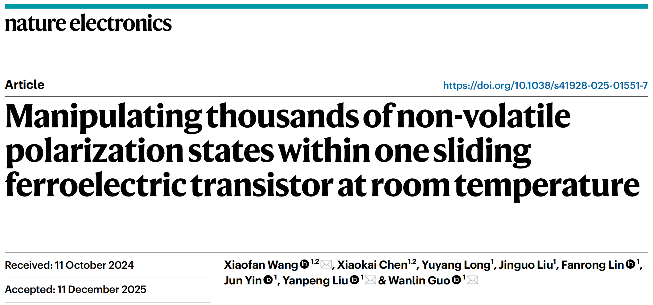 近日,南京航空航天大学国际前沿科学研究院郭万林院士/刘衍朋教授团队在电子信息领域顶级期刊Nature Electronics上发表了题为“Manipulating thousands of non-volatile polarization states within one sliding ferroelectric transistor at room temperature”的研究论文。
