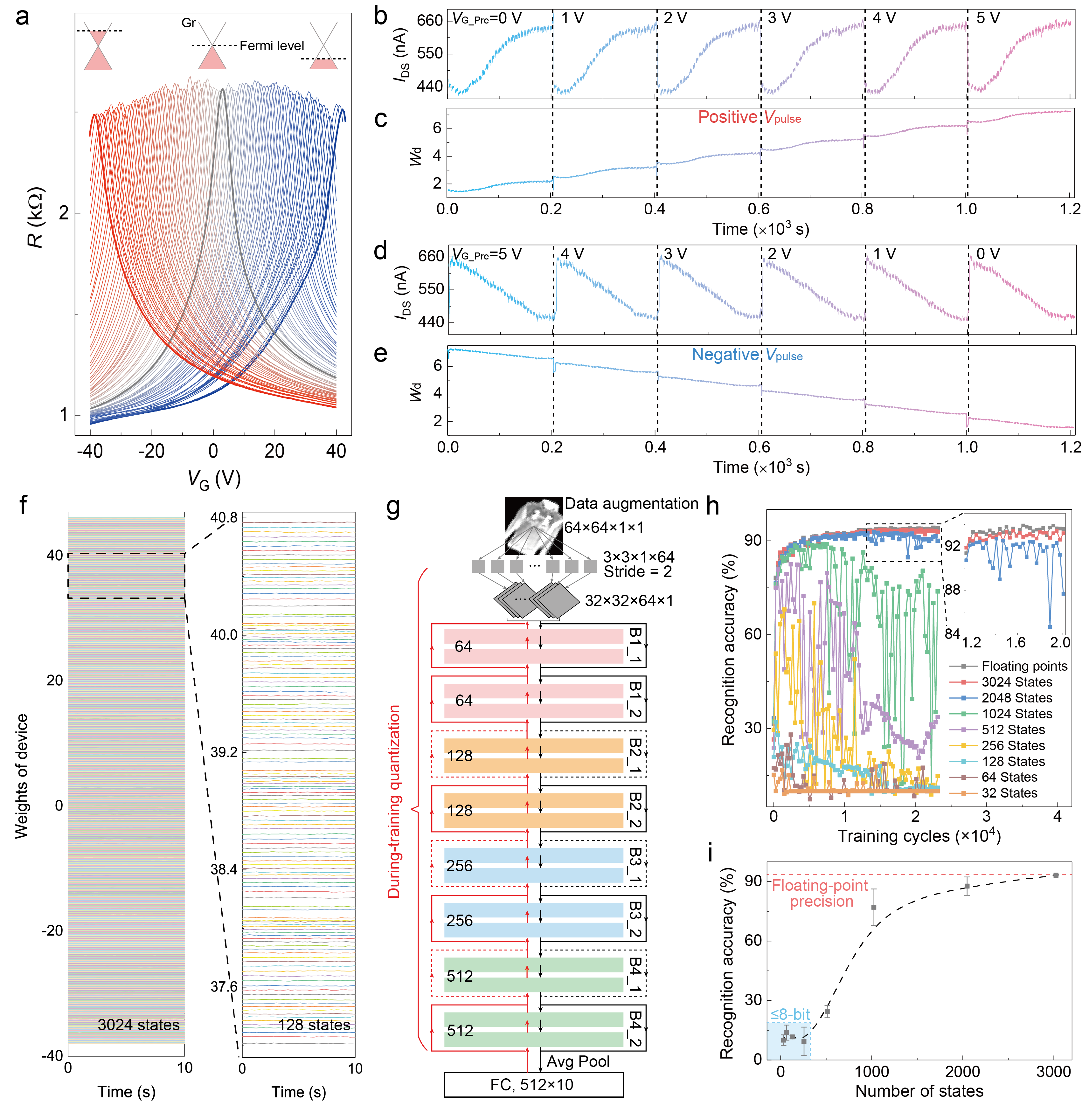 基于Gr/hBN器件中的双调控策略,通过精心设计的双参数扫描,最终实现了数千可分辨极化状态的完整演示。具体而言,在源-漏脉冲作用的同时叠加栅极电压,可使石墨烯费米能级在 84 个掺杂水平之间可逆调节。同时,在每一个掺杂态下都可通过源-漏脉冲生成超过 36 种准连续极化态,最终使单个器件中可调的非易失极化态数量增加到 3,024 种(84掺杂水平×36极化状态)。将这些状态应用于ResNet-18网络的训练中量化,系统对时尚图像数据集的识别精度高达93.53%,与标准浮点精度(94.15%)相差小于1%。