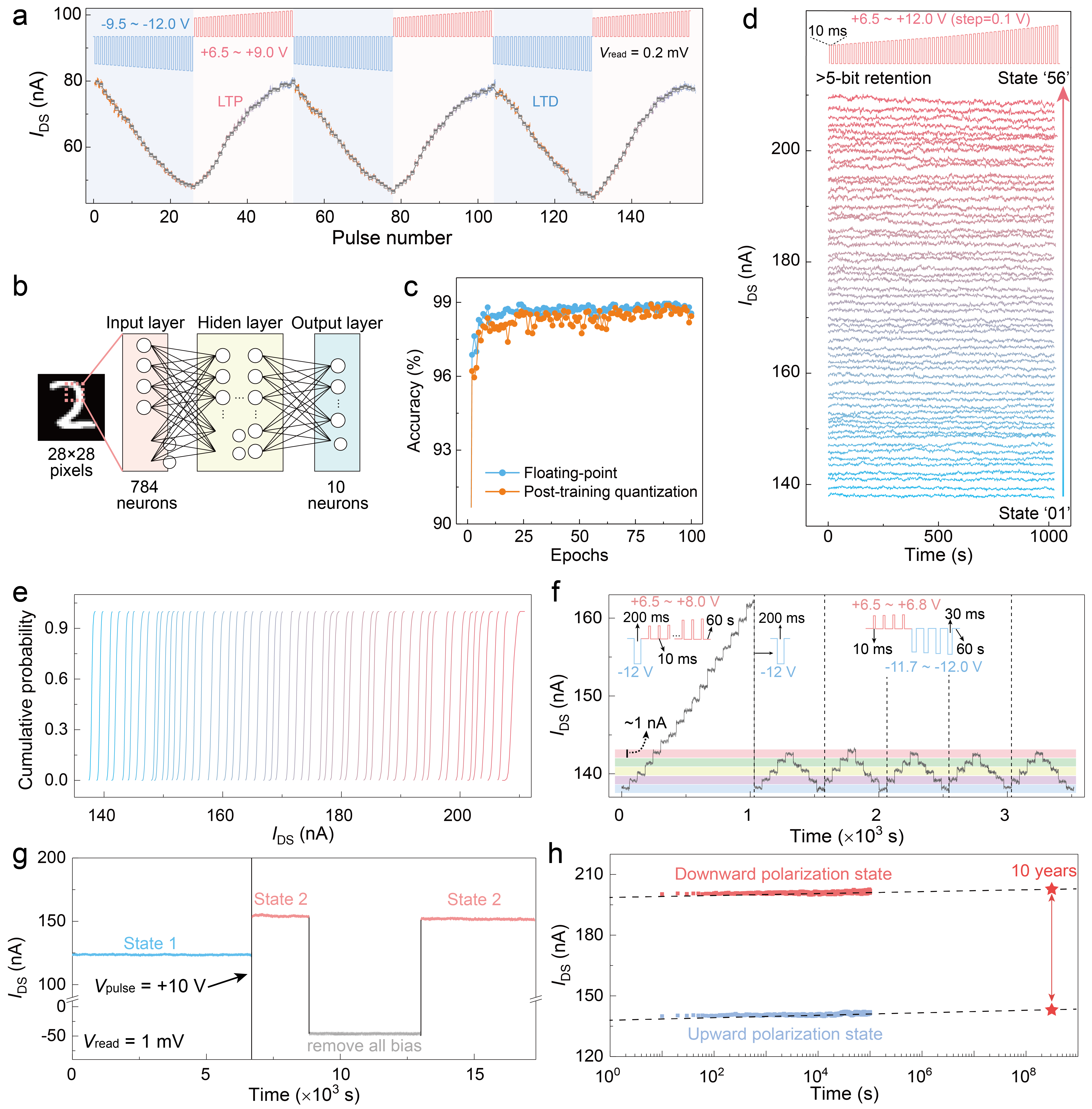 图5. Gr/hBN器件中通过双调控策略调制的数千室温非易失极化态及其神经网络应用模拟。