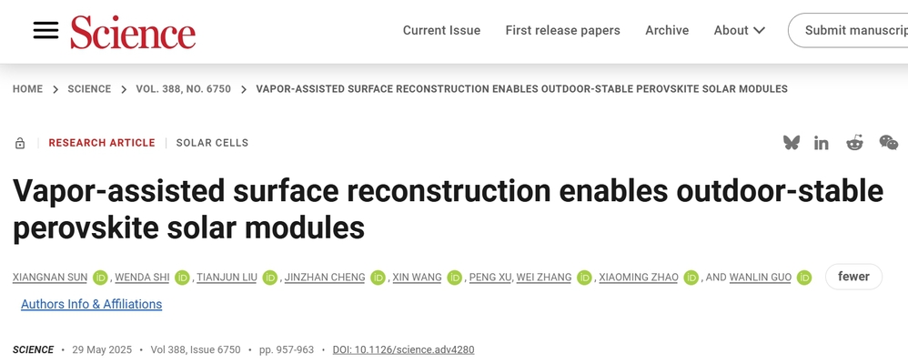 Xiangnan Sun#1,Wenda Shi#2,Tianjun Liu3,Jinzhan Cheng1,Xin Wang4,Peng Xu1,Wei Zhang1,Xiaoming Zhao1,Wanlin Guo1Science(IF:44.8),Epub 2025 May 29AbstractNatural illumination variations in light-dark cycles induce irreversible ion migration in perovskite solar cells, posing substantial challenges t...