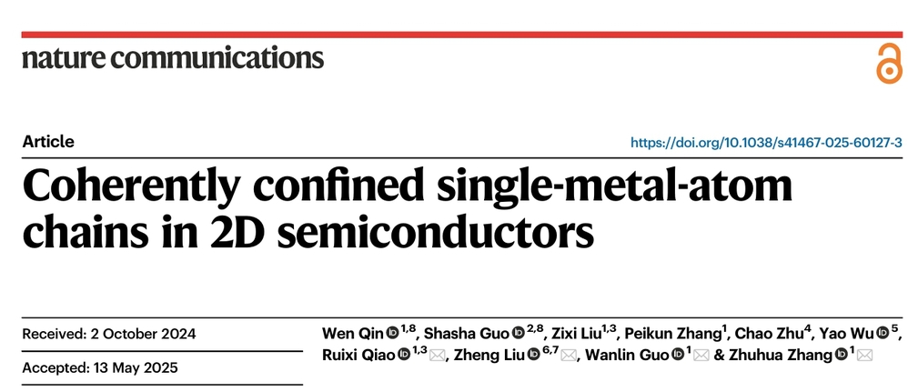 Wen Qin,Shasha Guo,Zixi Liu,Peikun Zhang,Chao Zhu,Yao Wu,Ruixi Qiao,Zheng Liu,Wanlin GuoZhuhua ZhangNature Communications(IF:16.6),Published: 27 May 2025AbstractSingle-metal-atom chains (SMACs) possess a variety of unique properties and functionalities but suffer from ambient vulnerability due to th...