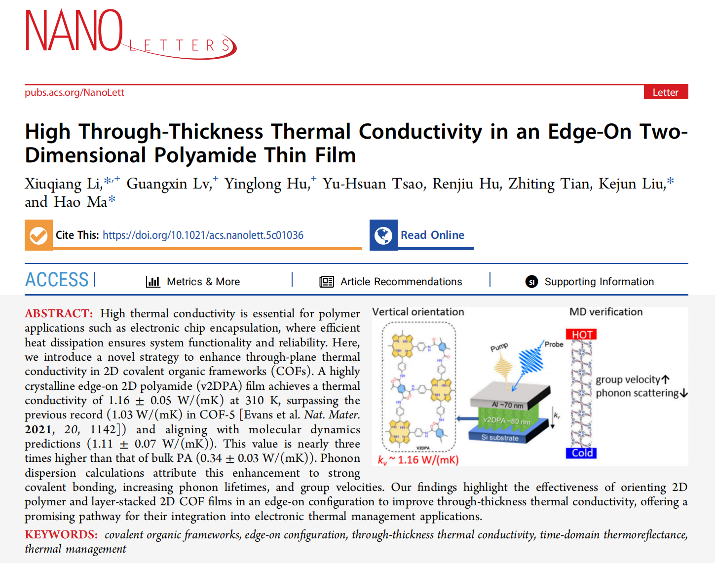 近日,南航国际前沿科学研究院郭万林院士团队李秀强教授在《Nano Letters》期刊上连续发表两篇重要研究成果。其中一篇研究聚焦于高热导率的二维共价有机框架(COF)薄膜,另一篇则探讨了一种具备高效加热与冷却管理能力的自清洁Janus纺织品。这两项研究成果为现代电子设备的热管理以及户外环境下的热舒适性提供了创新性的技术方案。