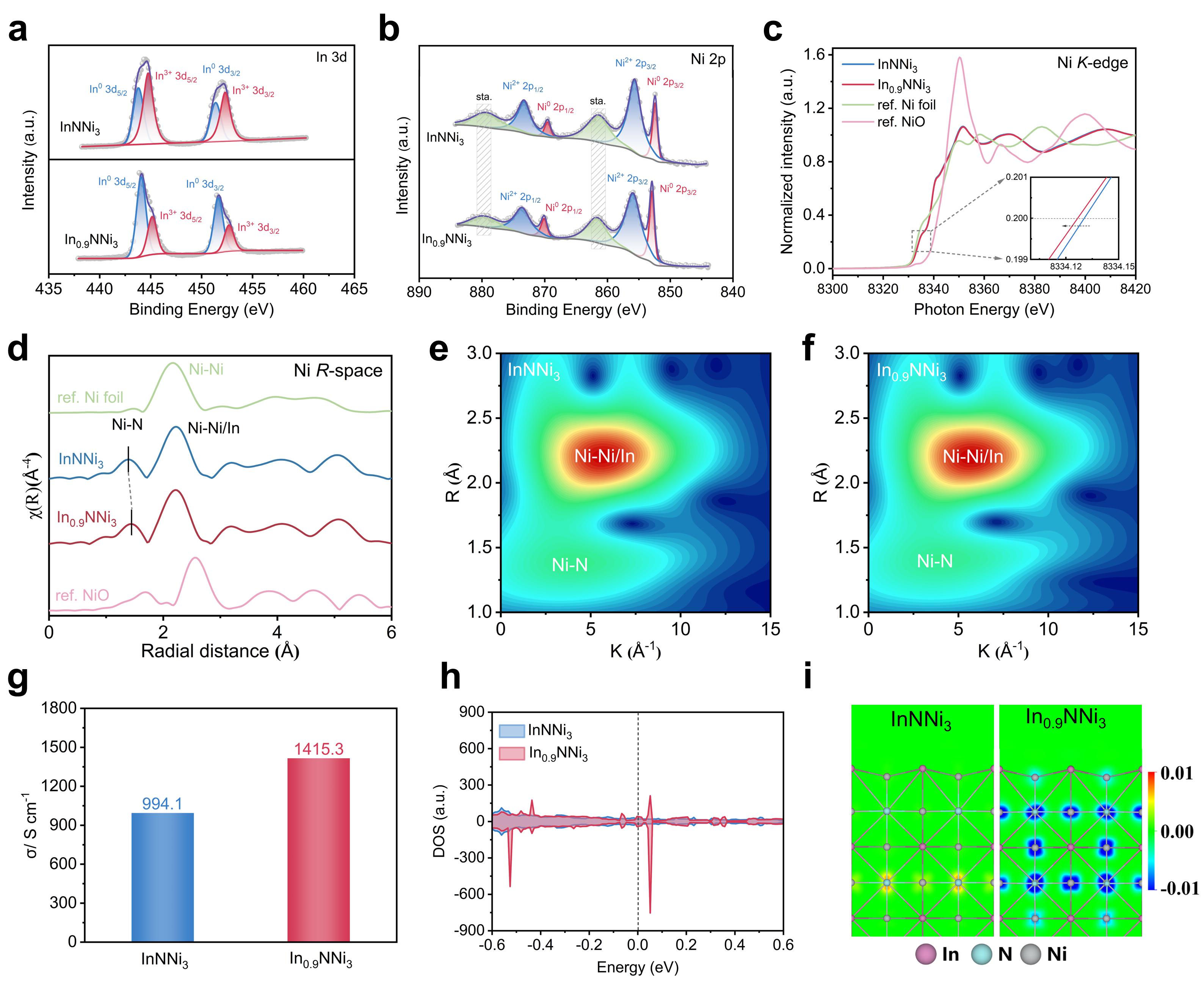 XPS和XAS分析揭示了In0.9NNi3高活性的关键因素。如图3,在In0.9NNi3中,In缺陷的引入显著增加了金属态In0和Ni0的含量,并表现出较强的抗氧化能力。值得注意的是,In0.9NNi3中Ni-N键的伸长为OH⁻脱附提供了有利条件。此外,In0.9NNi3的导电性能优于化学计量比的InNNi3。态密度和自旋电荷差分析进一步证实,In缺陷的引入导致费米能级附近电子态密度增加,同时Ni位点积累了更多电子,这些特性促进了电子的转移,有利于提高HER催化性能。