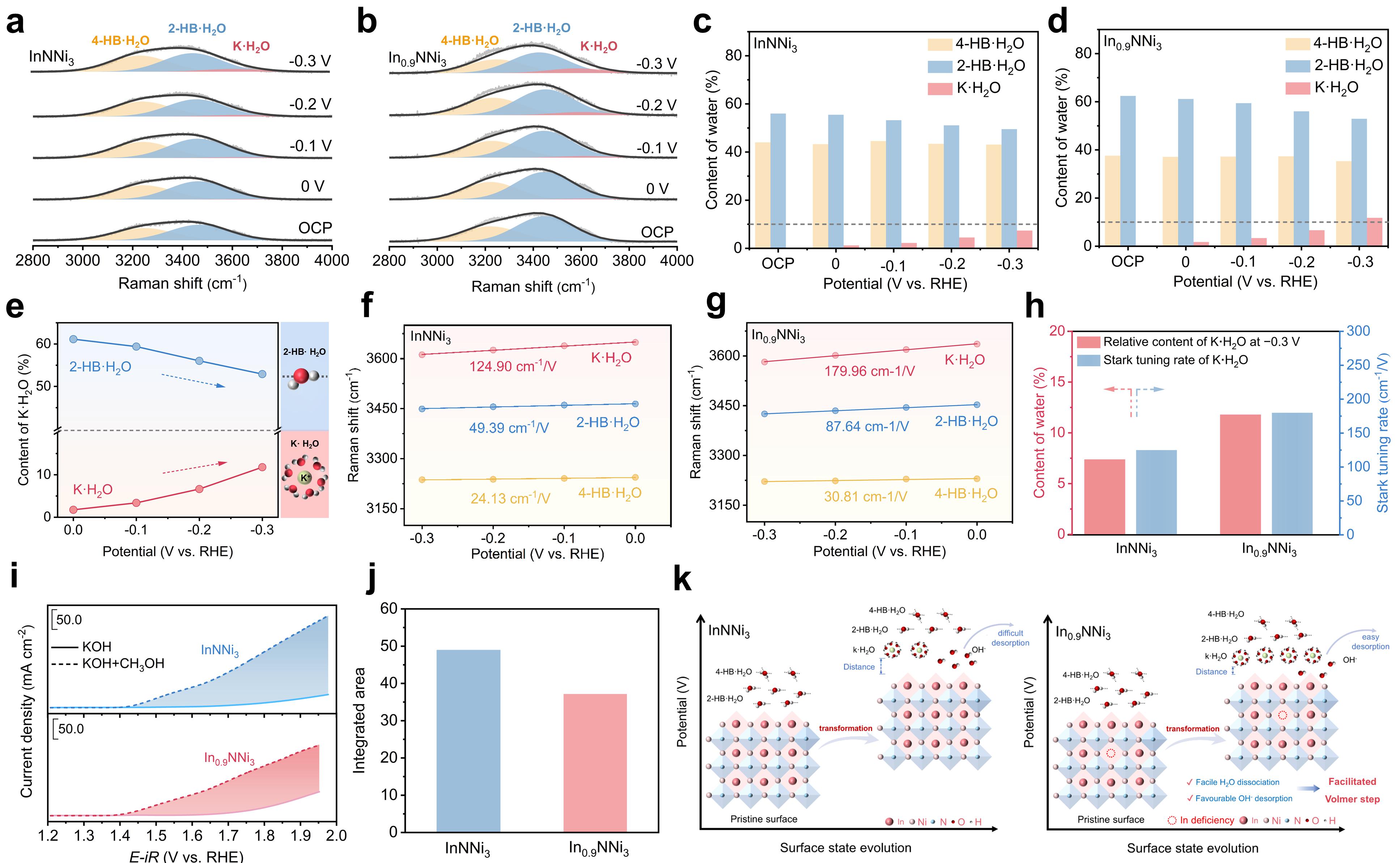 如图4,通过原位拉曼光谱测试发现,In0.9NNi3表面具有更高的自由水(K·H2O)覆盖率和更显著的振动斯塔克效应,表明其水解离能力更强,更易实现水的O-H键断裂。此外,甲醇氧化实验显示出In0.9NNi3对OH*的吸附更弱,有利于OH-脱附。这些特性共同加速了Volmer步骤,从而显著提升了其碱性HER活性。