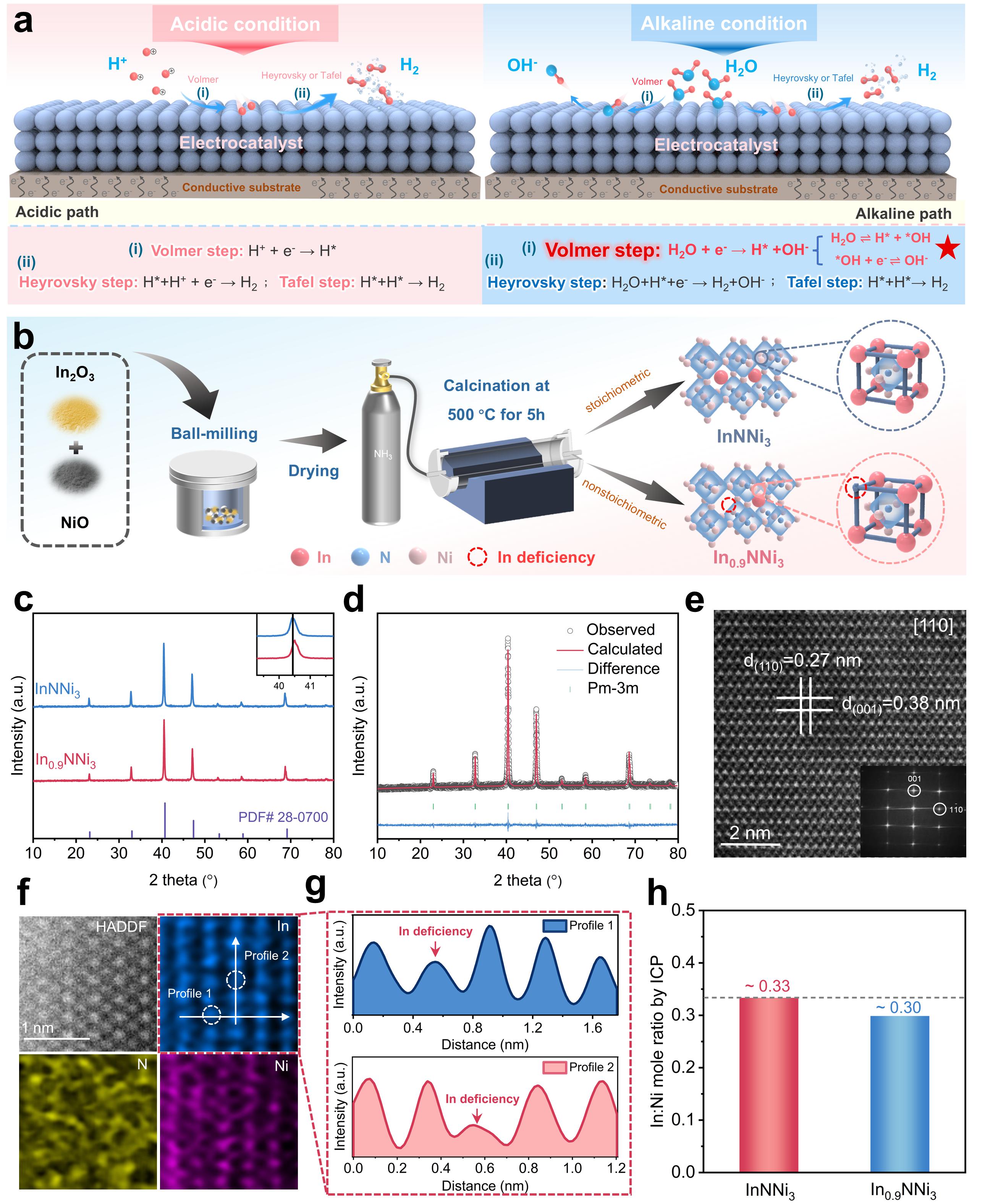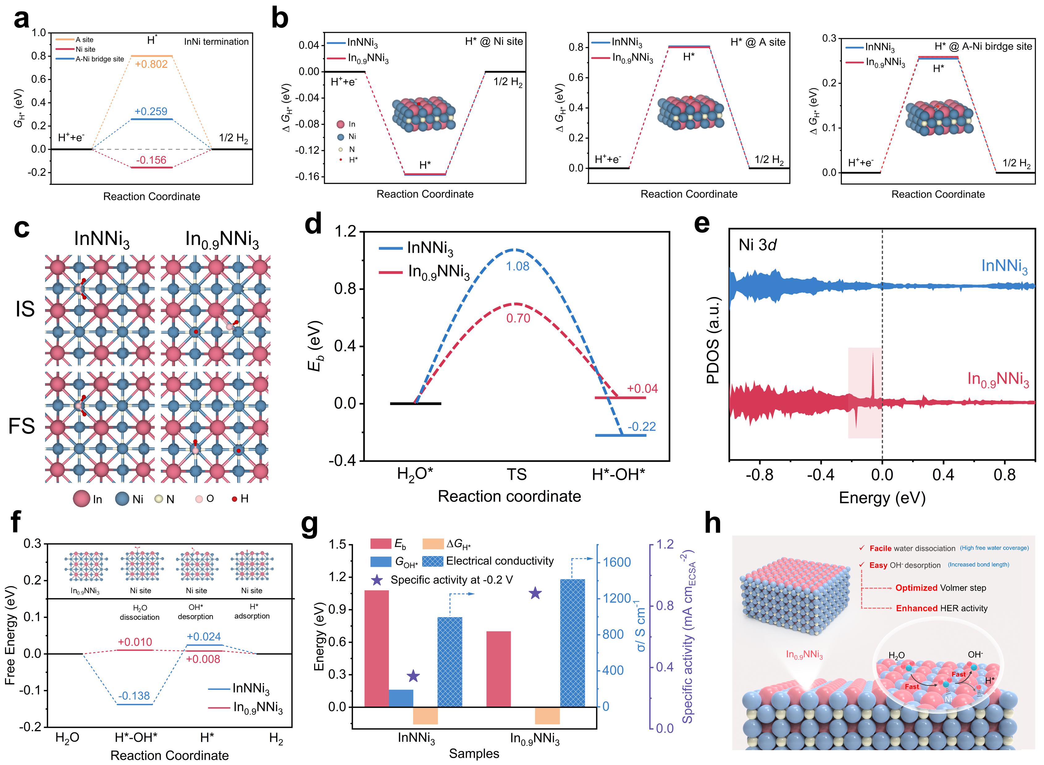 密度泛函理论计算结果表明,In0.9NNi3在碱性条件下表现出增强的碱性HER活性源于其Ni活性位点中优化的Volmer步骤。如图5所示,In0.9NNi3中的Ni位点通过增强自由水吸附促进水解离,并通过延长Ni-N键促进OH-脱附,从而加速整体Volmer反应。同时,这些Ni位点作为氢吸附的主要活性位点,最终使得In0.9NNi3在碱性条件下展现出更优异的HER性能。此外,这种引入A位阳离子缺陷的策略同样适用于其他反钙钛矿材料(如ZnNNi3和CuNNi3)。