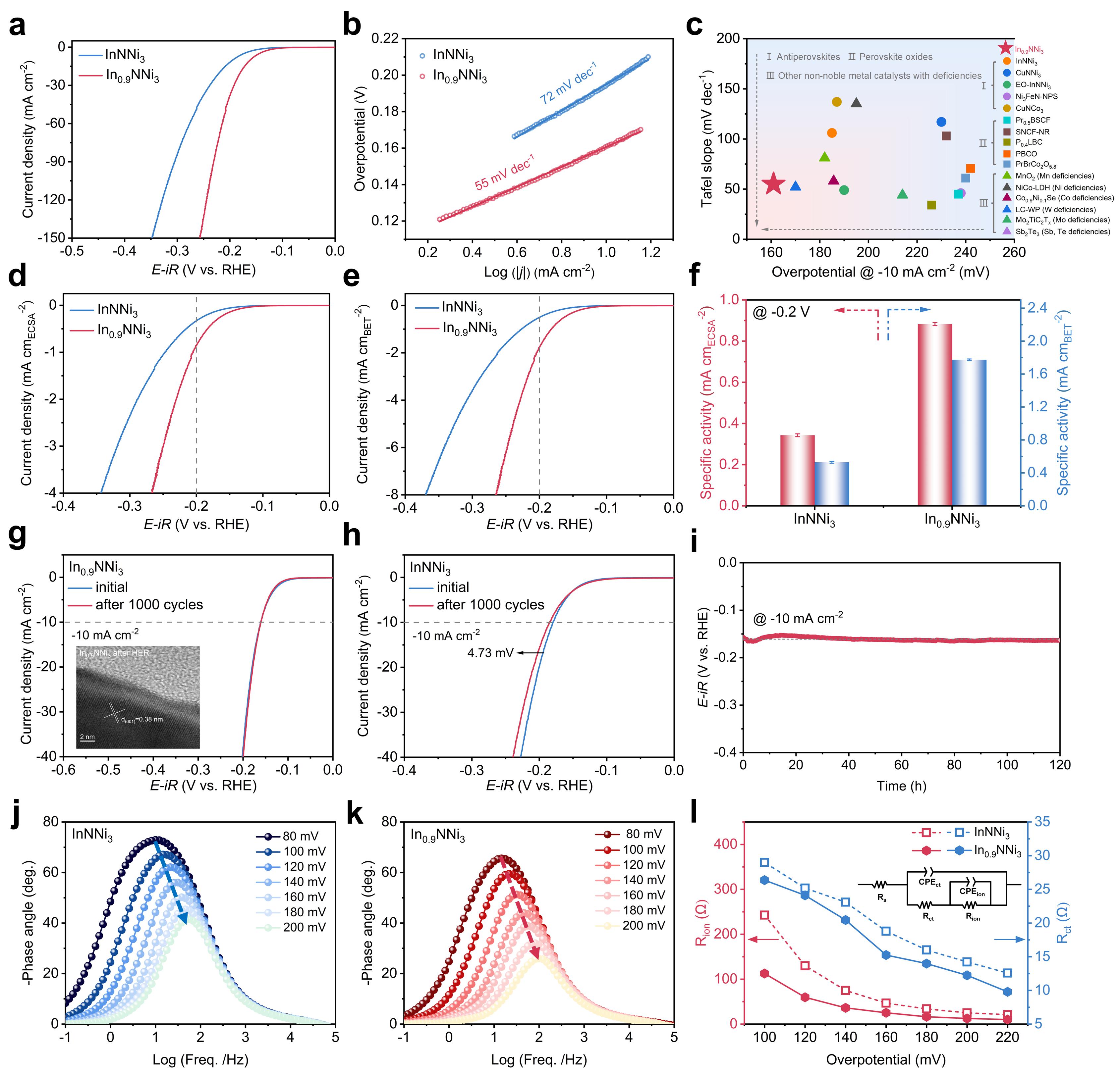 研究揭示了In0.9NNi3反钙钛矿材料在碱性HER中的优异性能。如图2,实验表明,In0.9NNi3在1 M KOH中仅需161 mV过电位即可达到10 mA cm-2电流密度,其Tafel斜率(55 mV dec-1)显著低于化学计量比的InNNi3(72 mV dec-1),表明In缺陷的引入有效加速了反应动力学。将电流密度归一化到ECSA和BET表面积后,In0.9NNi3表现出更高的本征活性,且法拉第效率接近100%。加速耐久性测试(ADTs)和120小时的计时电位法(CP)测试表明,In0.9NNi3具有良好的稳定性,其结构和形貌在HER过程中保持稳定。原位EIS分析证实In0.9NNi3具有更低的电荷转移电阻和更快的Volmer步骤,这归因于优化的电子传输和中间体吸附/脱附过程。