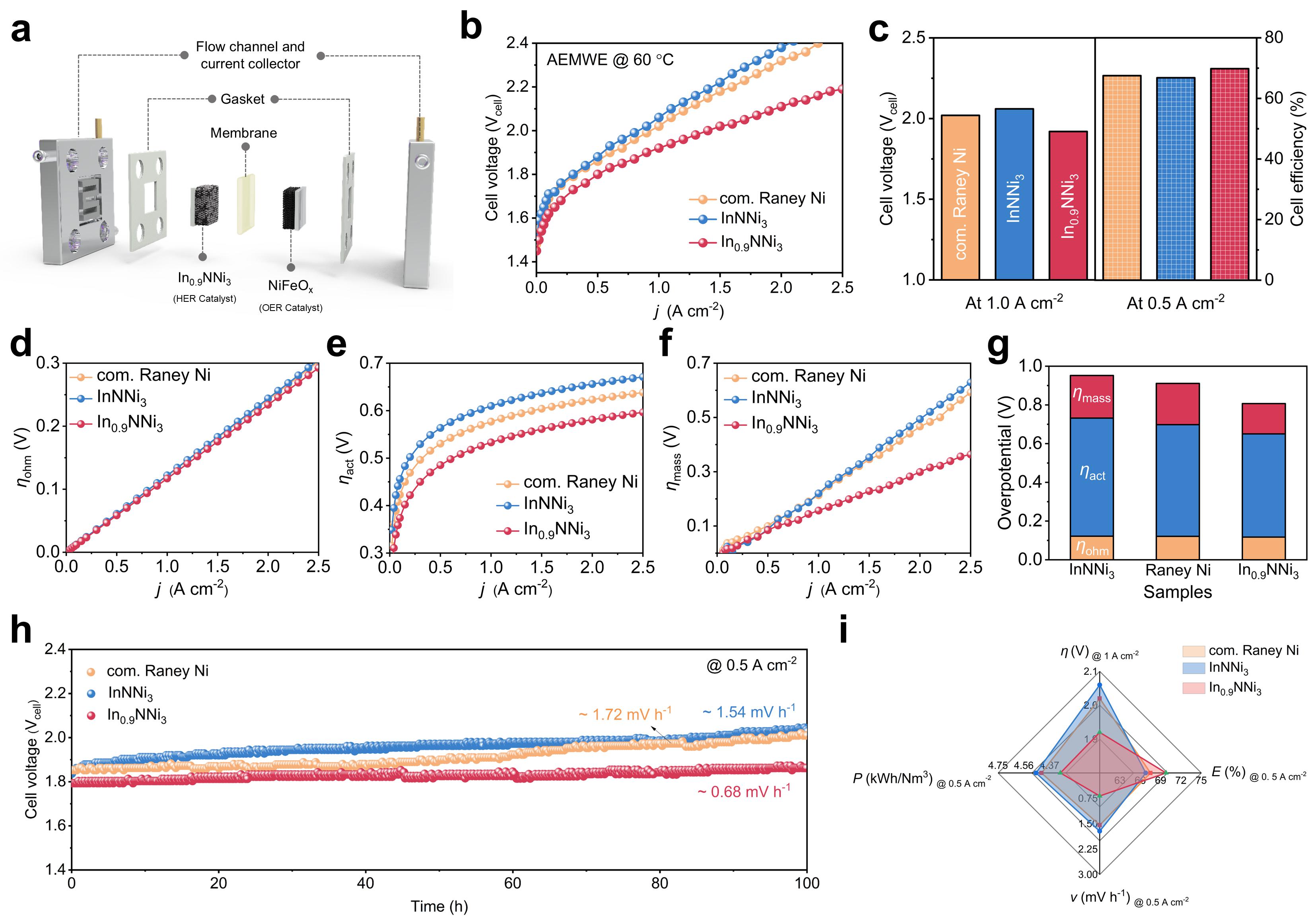 为评估In0.9NNi3的实际应用性能,研究团队构建了以In0.9NNi3为阴极、NiFeOₓ为阳极的阴离子交换膜水电解槽(AEMWE),如图6所示。测试结果表明,在1.0 A cm-2电流密度下,该电解槽仅需1.92 V的低电池电压,性能优于InNNi3和商业Raney Ni催化剂。在0.5 A cm-2电流密度下,其电池效率高达69.8%,且欧姆、活化和传质过电位均低于InNNi3和商业Raney Ni基电解槽。耐久性测试表明,在0.5 A cm-2的电流密度下运行100小时后,In0.9NNi3基电解槽电池电压衰减速率为0.68 mV h-1,显著低于InNNi3和商业Raney Ni基电解槽,同时制氢能耗低至4.29 kWh Nm-3,表明其在实际AEMWE应用中极具潜力。