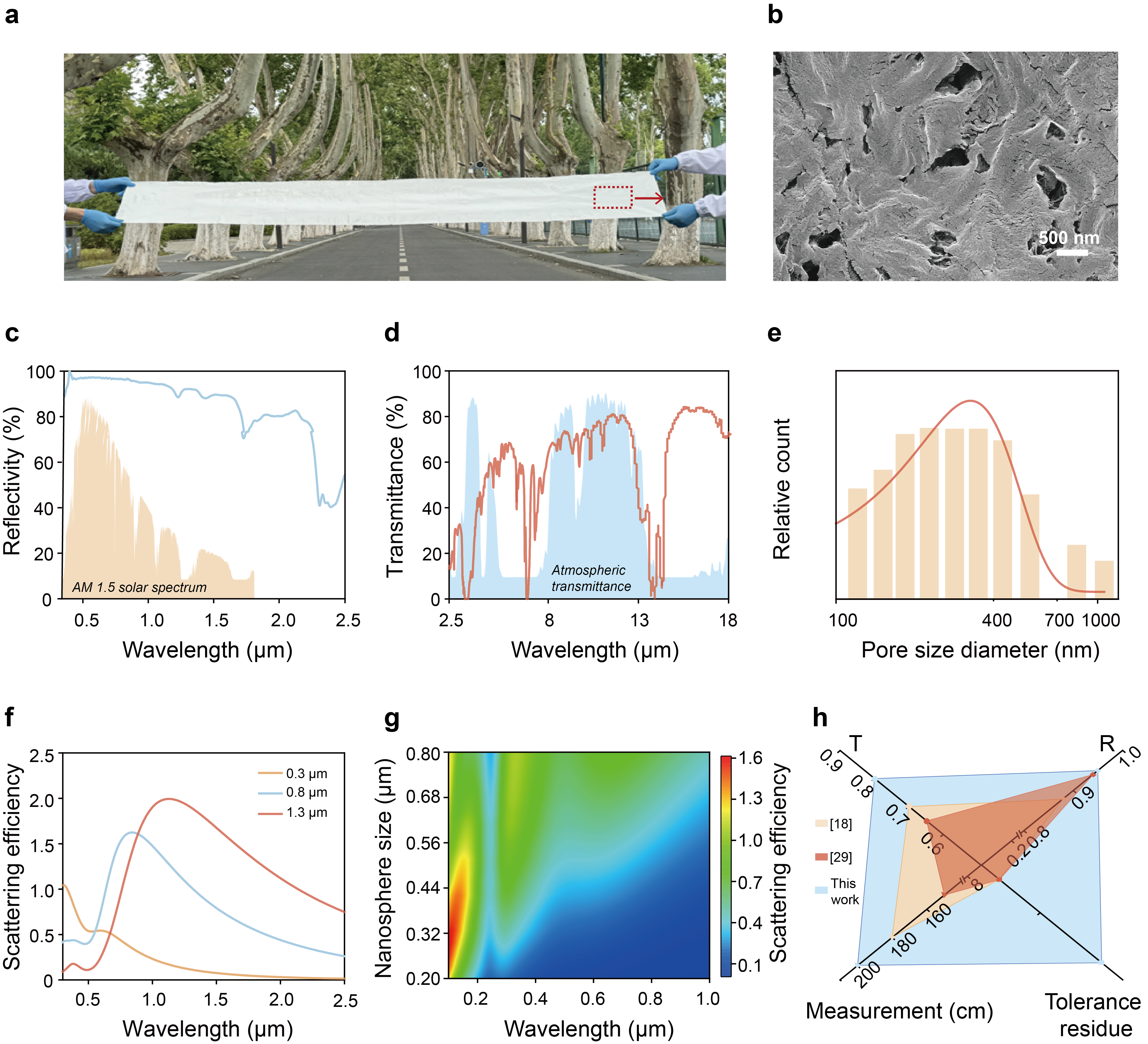 通过系统优化材料配比、膜厚控制和工艺参数,团队成功制备出长度达2米的高性能薄膜产品。如图3所示,该薄膜表现出卓越的光学性能:太阳能反射率高达95%,人体热辐射波段(8-13 μm)透过率超过80%,关键性能指标均达到国际领先水平。