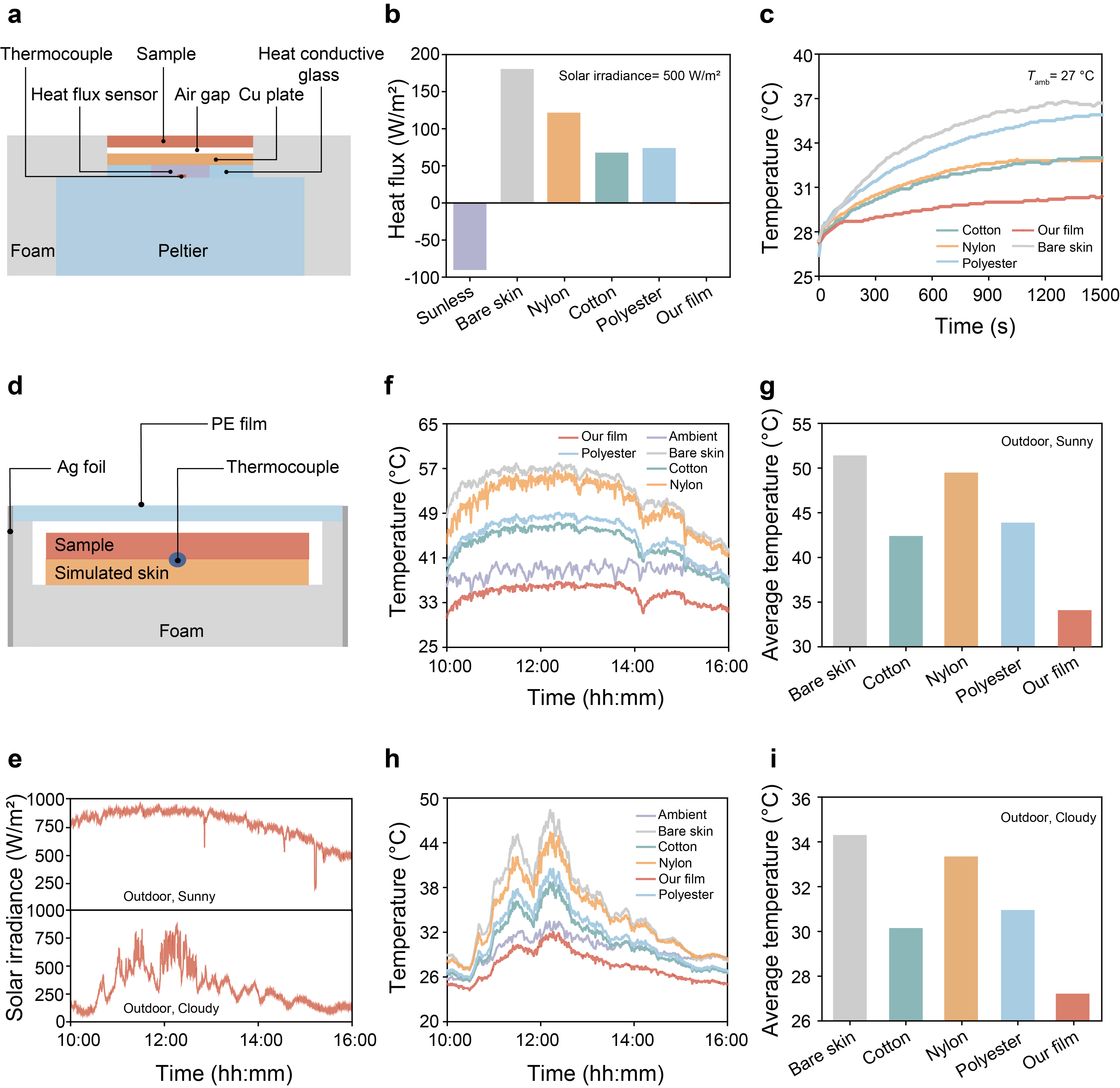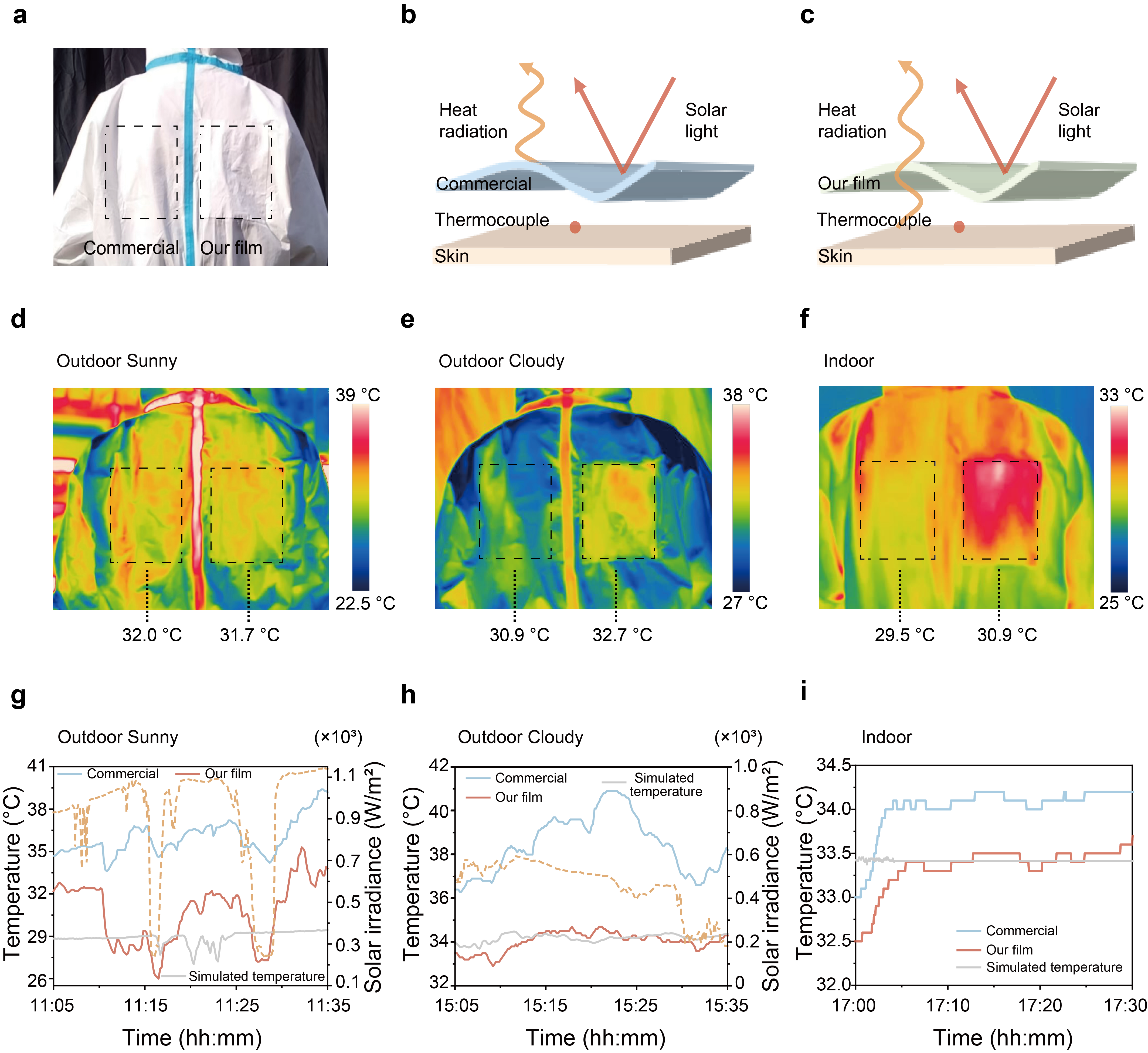研究团队对薄膜的制冷性能进行了全面评估。如图4所示,在晴天(太阳辐照度约730 W/m²)和阴天(约280 W/m²)条件下,薄膜分别实现了低于环境温度4 °C和3 °C的亚环境冷却效果。特别值得关注的是,在人体穿着测试中(图5),集成该薄膜的防护服在晴天户外可使体表温度比商用防护服低5 °C,展现出显著的降温效果。
