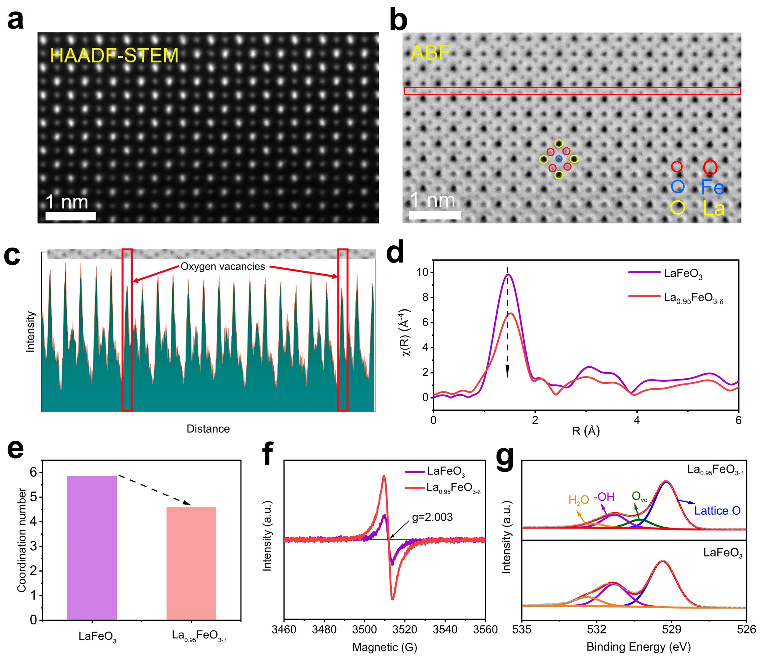 一系列表征研究揭示了在La0.95FeO3-δ钛矿材料中含有丰富的氧空位。如图2,HAADF-STEM和ABF图像揭示了部分对比度较弱的单个氧原子位点,为氧空位的形成提供了直接证据。同时,通过分析FT-EXAFS探究了LaFeO3和La0.95FeO3-δ中铁离子的局域配位环境,此外,EPR、XPS分析进一步证明了La0.95FeO3-δ中氧空位的存在。