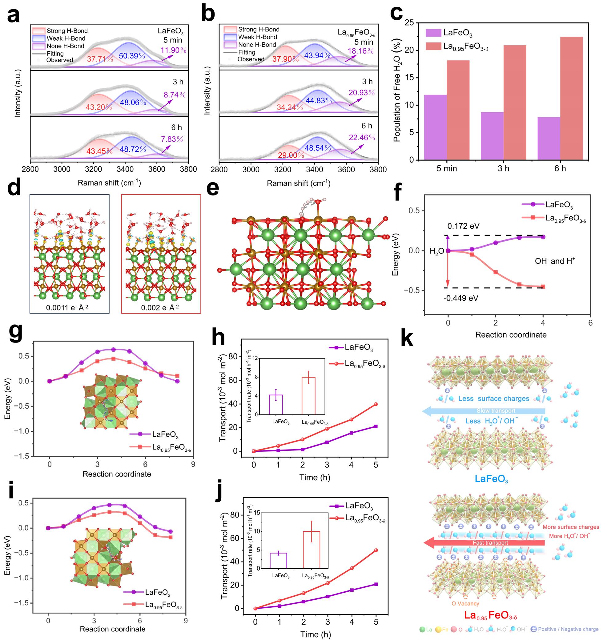 为阐明氧空位促进水蒸发诱导发电性能提升的内在机制,如图5所示,研究团队进行了原位拉曼测试,发现在La0.95FeO3-δ的固液界面具有更高比例的自由水富含率,表明其水解离能力更强,更易实现水的O-H键断裂和氢键的断裂,有利于水的解离和蒸发。此外,基基于密度泛函理论计算研究进一步揭示了氧空位对水蒸发诱导发电的影响。引入氧空位后,固液界面的电荷转移效率得到提升。同时,钙钛矿中的氧空位还能降低水的解离能垒以及质子和氢氧根的迁移能垒,可在固液界面生成更多的质子和氢氧根,并提升离子的迁移速率,最终使得La0.95FeO3-δ表现出更优异的水蒸发诱导发电性能。