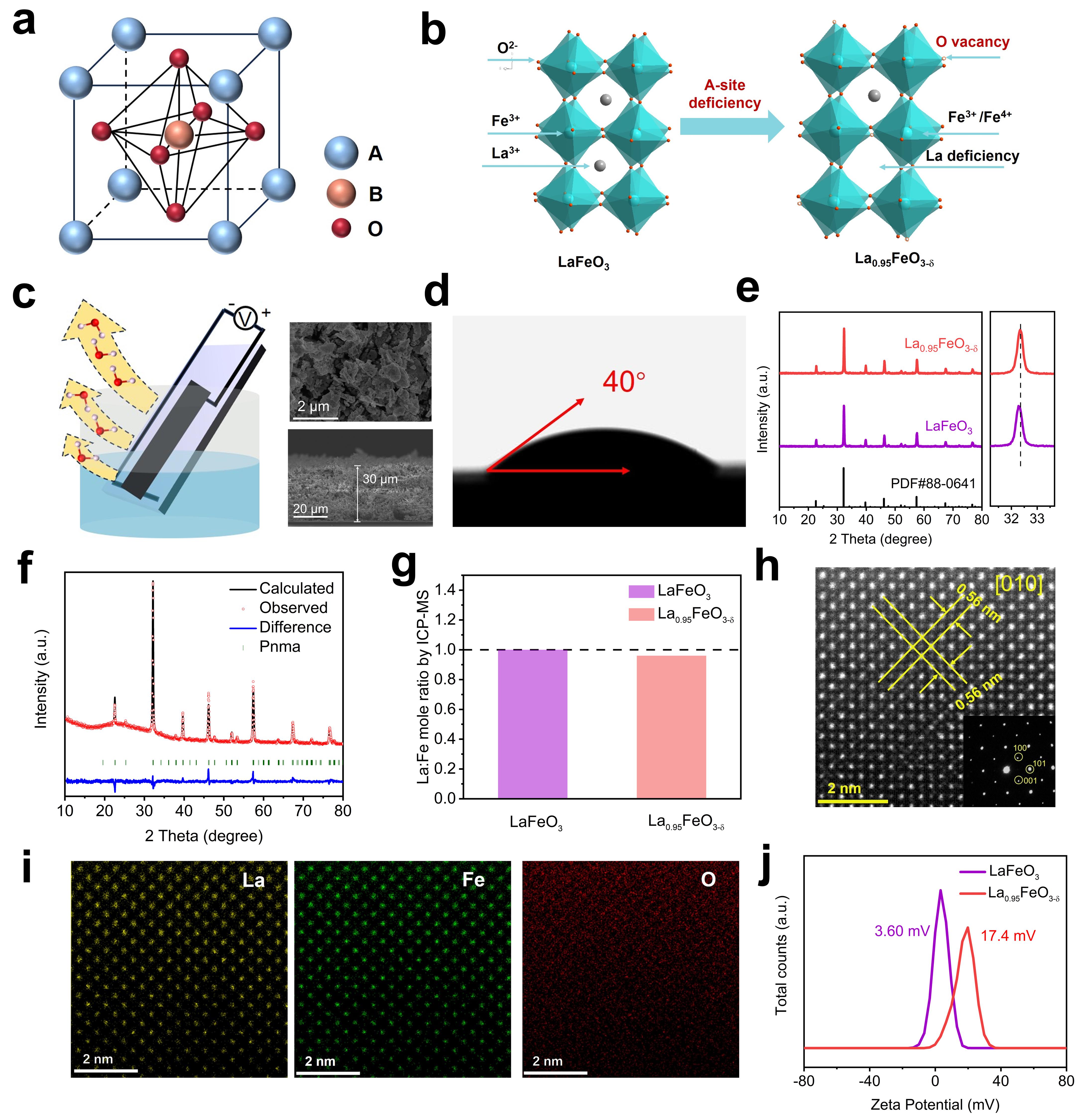 如图1,研究人员通过一种简便的溶胶-凝胶法成功合成了化学计量比的LaFeO3和非化学计量比的La0.95FeO3-δ。XRD结果显示,LaFeO3和La0.95FeO3-δ均形成纯正交钙钛矿结构,二者均具有空间群为Pnma,ICP-MS确认了材料的实际组成与预期一致,HRTEM和EDS分析进一步验证了La0.95FeO3-δ的晶体结构和元素分布均匀性。此外,从Zeta电位测量结果可以看出,La0.95FeO3-δ材料的Zeta电位显著高于LaFeO3,这意味着其可能在水分蒸发诱导发电性能方面具有优异表现。
