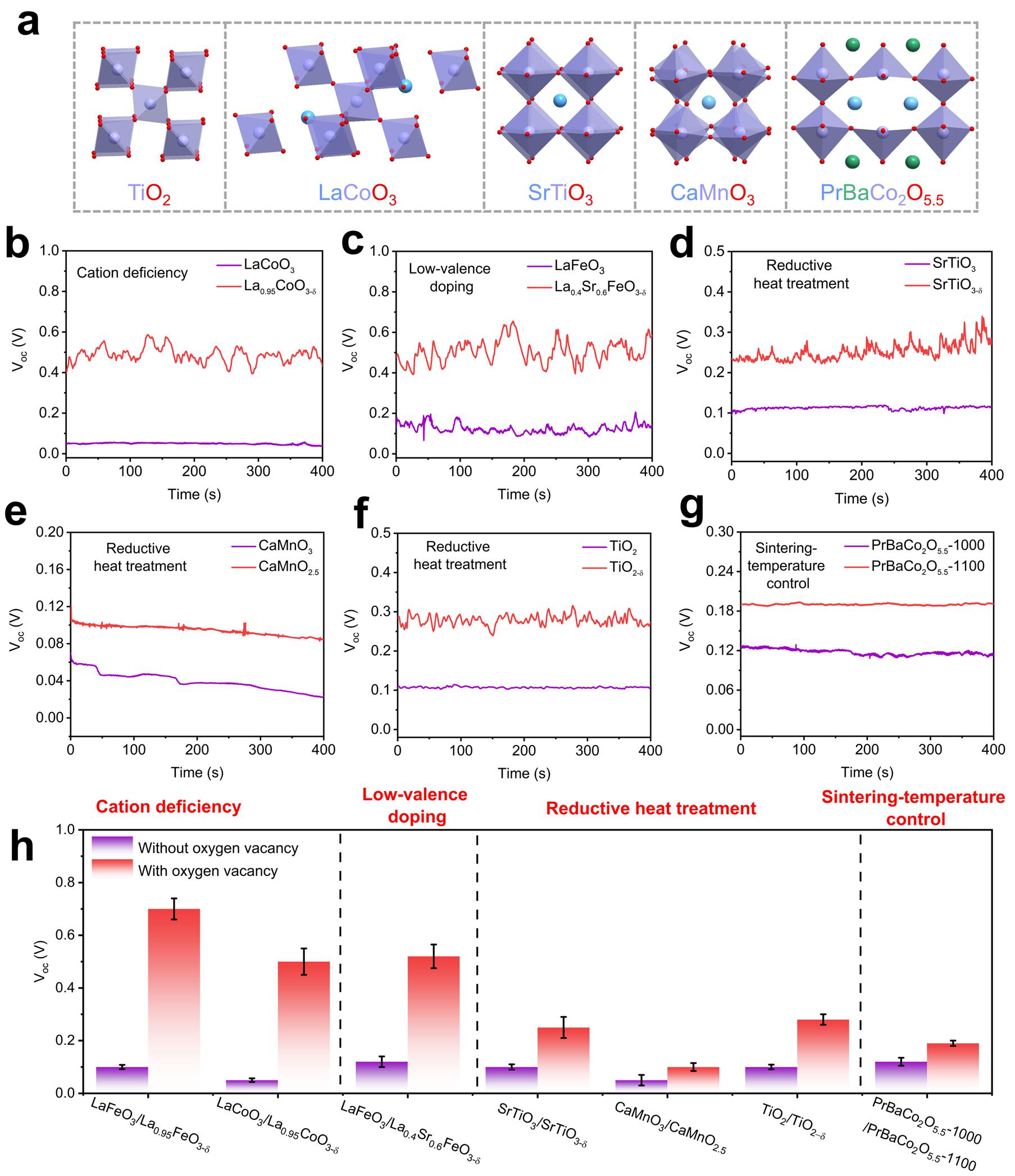 如图6所示,为评估氧空位调控提升水蒸发诱导发电性能这一策略的普适性,研究团队们采用了阳离子缺失、低价掺杂、还原热处理、控制烧结温度等有效方案,成功合成了一系列富含氧空位的金属氧化物、钙钛矿氧化物以及双钙钛矿氧化物。与LaFeO3类似,其他富含氧空位的金属氧化物也展现出比母体氧化物更高的开路电压值,验证了在金属氧化物中引入氧空位时水蒸发诱导发电性能普遍提升的现象。