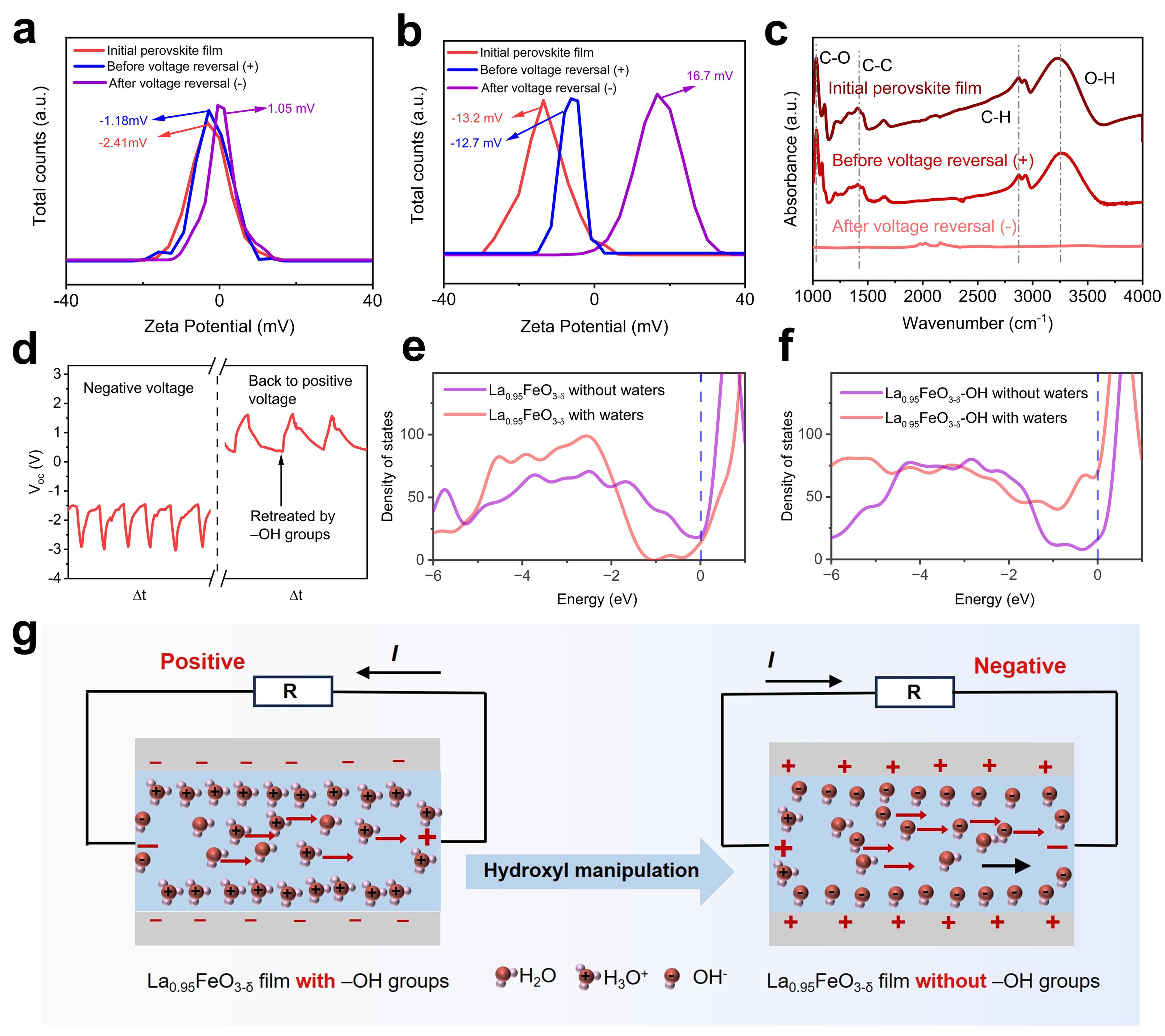 如图4,通过对水蒸发诱导发电过程的不同阶段Zeta电位测量,发现随着开路电压从正值转变为负值,LaFeO3和La0.95FeO3-δ的Zeta电位值均由负值变为正值,表明电压翻转现象是由表面电荷的变化引起的。为进一步解释电压翻转现象的内在原因,研究团队进行FTIR测试及密度泛函理论计算,证明羟基在调控表面电荷中有着关键作用。